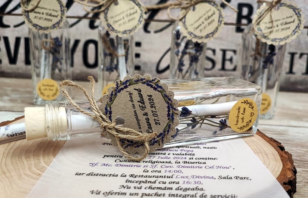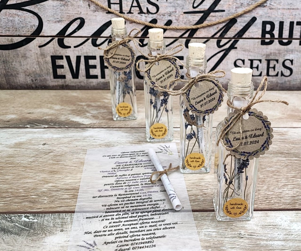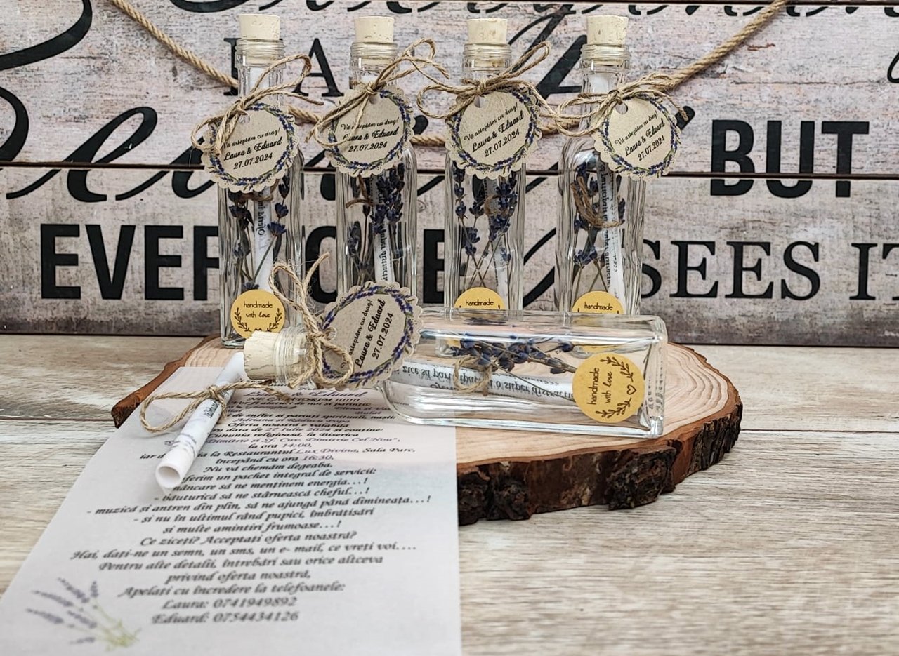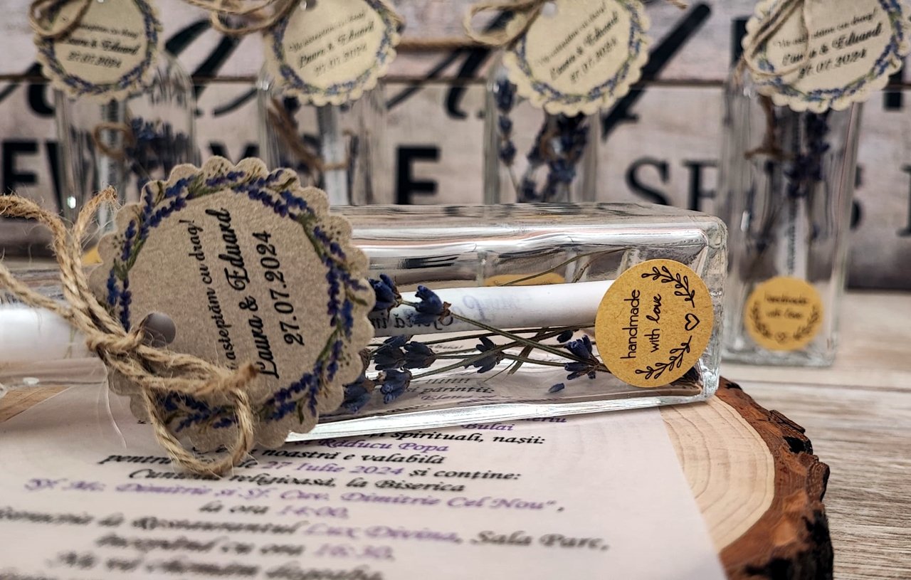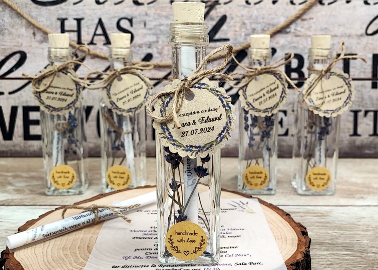 Sticluta este decorata cu flori uscate si fire de lavanda naturala parfumata. Pe fata este lipita o eticheta ce atesta calitatea de produs Handmade. Fiecare sticluta este personalizata cu o eticheta rotunda din carton craft perlat cu numele si data evenimentului.