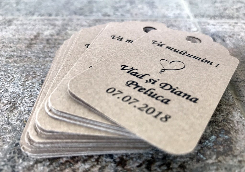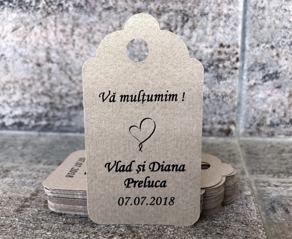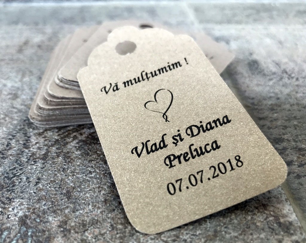Eticheta se personalizeaza cu numele mirilor si data evenimentului.