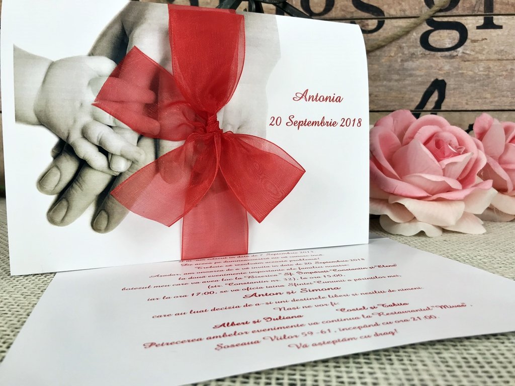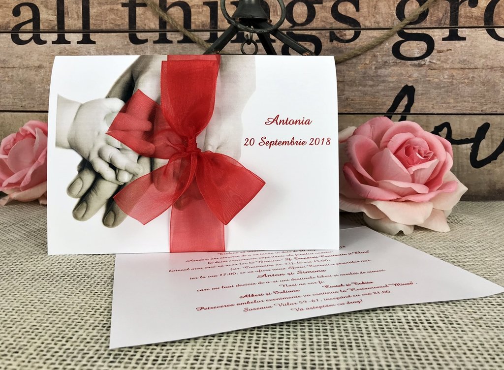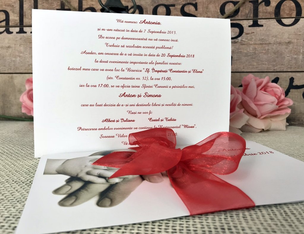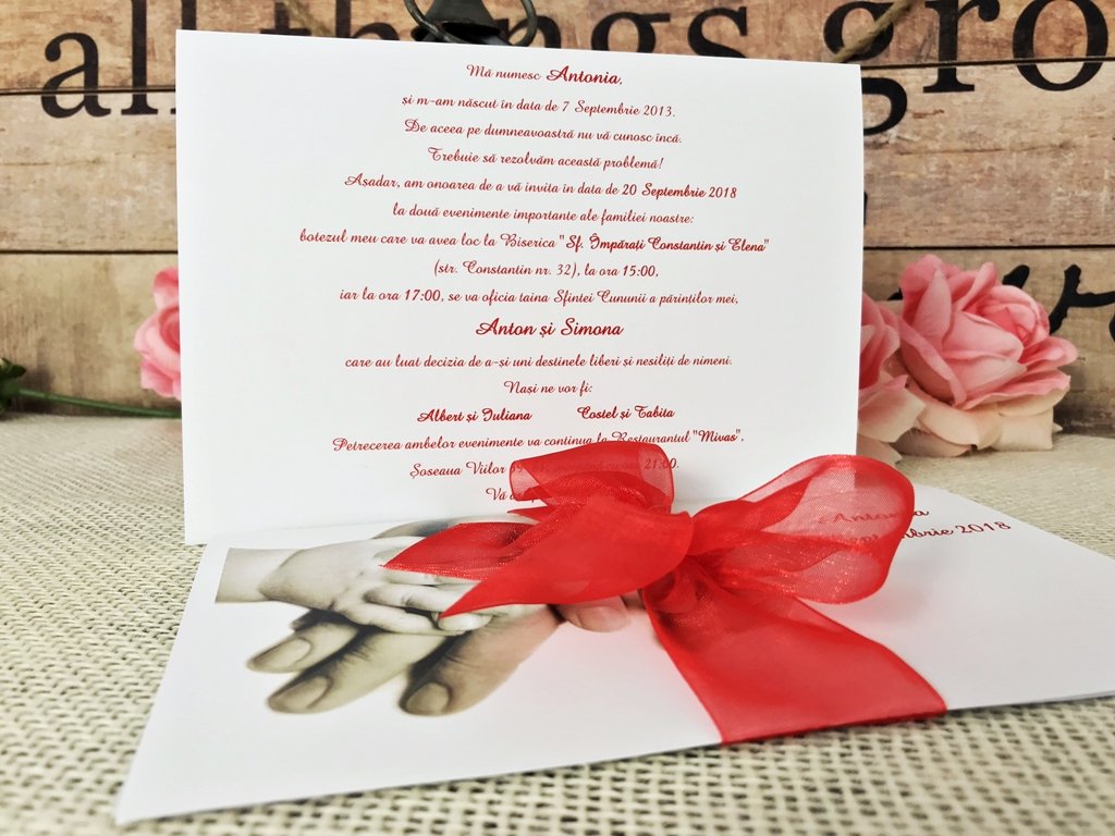 Invitatia nu are si nu necesita plic. Ea se inchide cu fundita de organza asortata.
