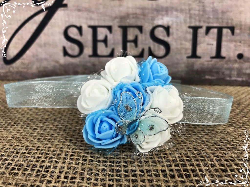 Un corsaj splendid pentru domnisoarele de onoare  realizat din pamblica de organza blue cu latimea de 2 cm si acesorizat cu trandafiri albi si albastri si un fluture cu pietricica blue.