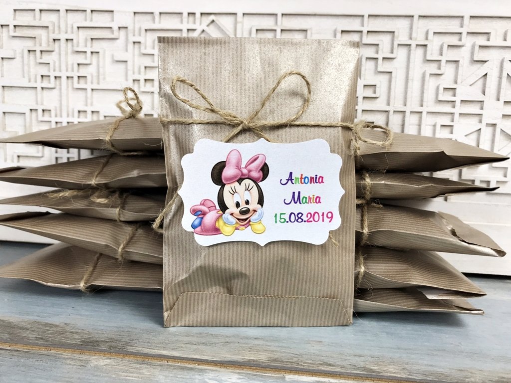 Plicul este realizat din carton craft perlat. Contine doi biscuiti Oreo, ambalati corepunzator in folie alimentara transparenta. Pe fata plicului este legat un snur din iuta. Eticheta este personalizata cu numele bebeluslui si data evenimentului.