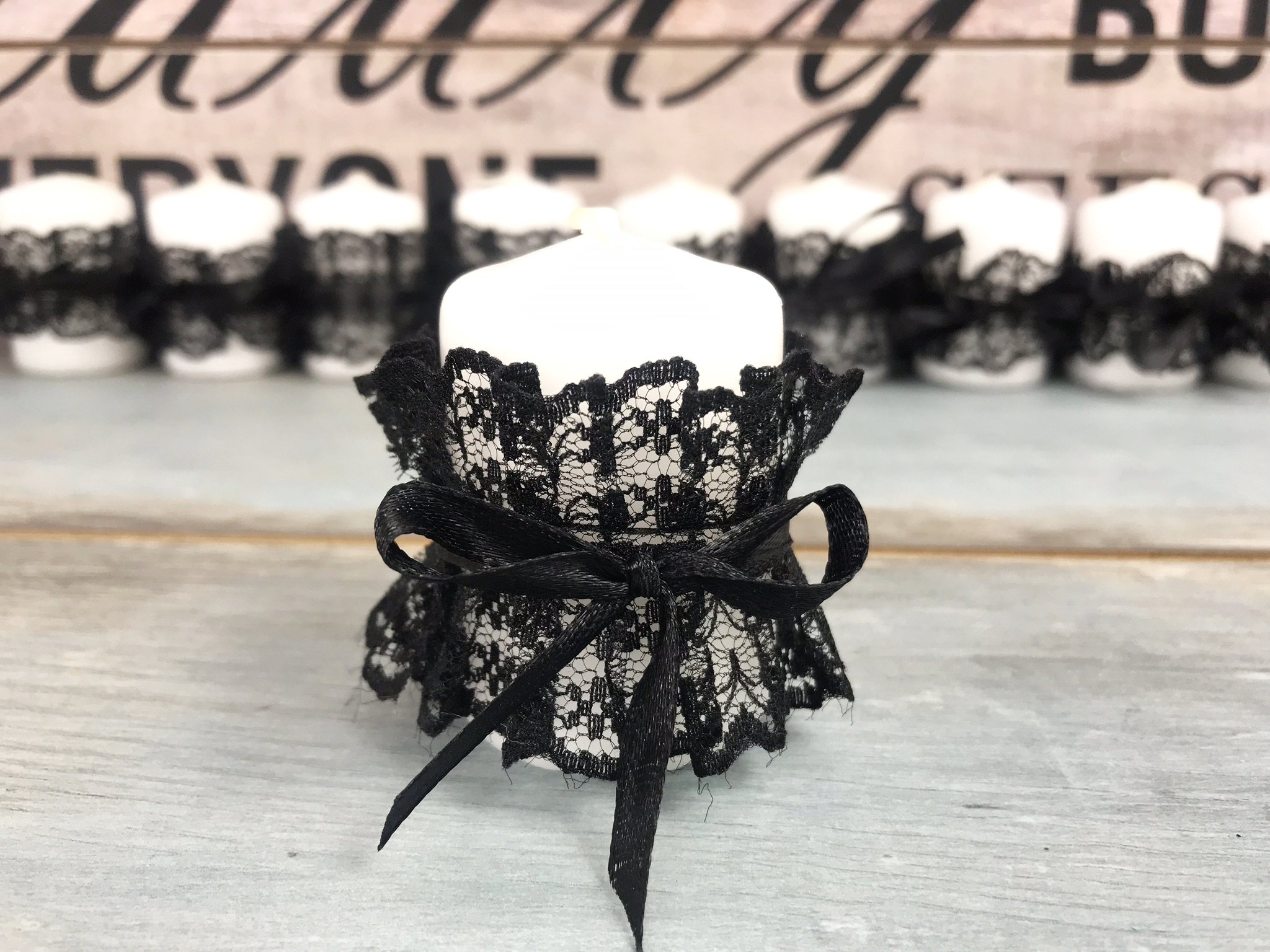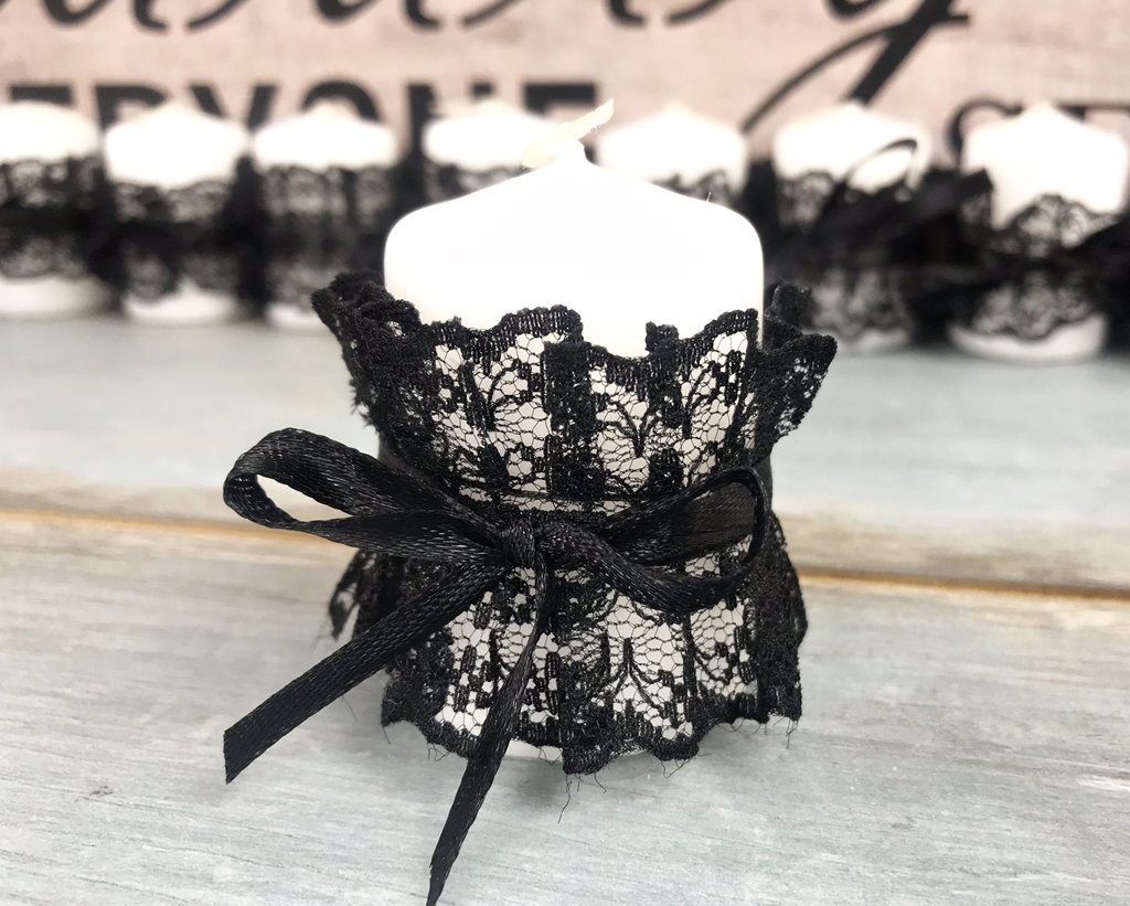 Marturie in forma de lumanare decorate cu o dantela neagra in forma de rochita.