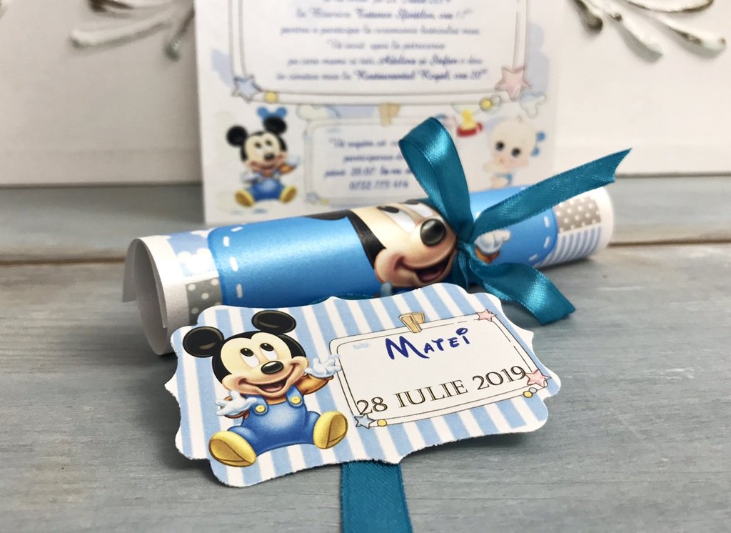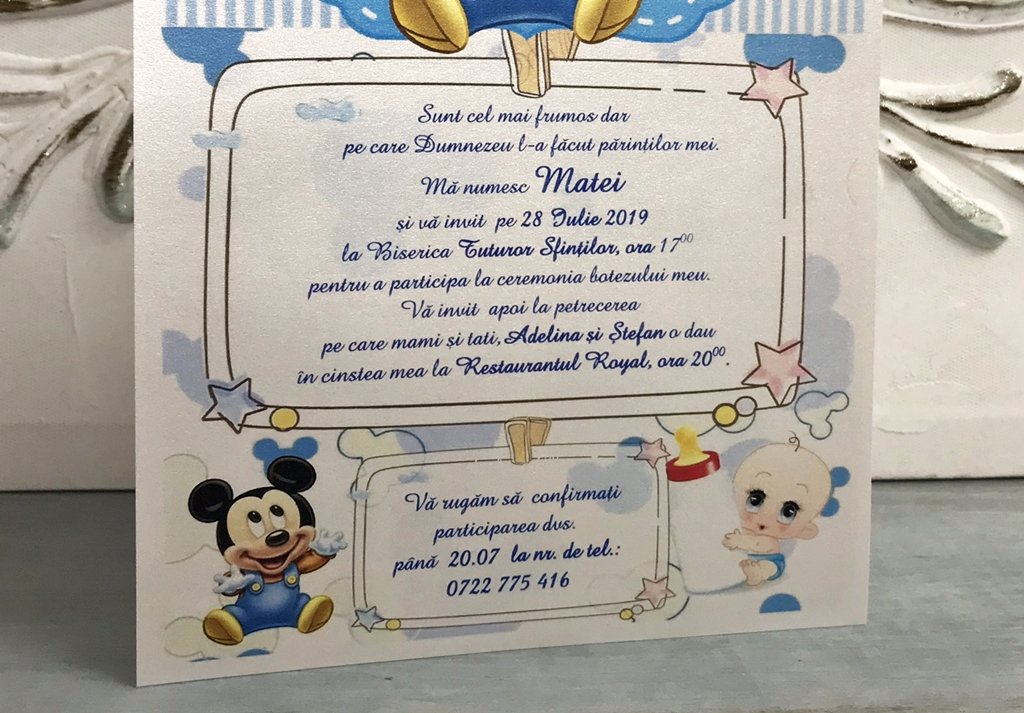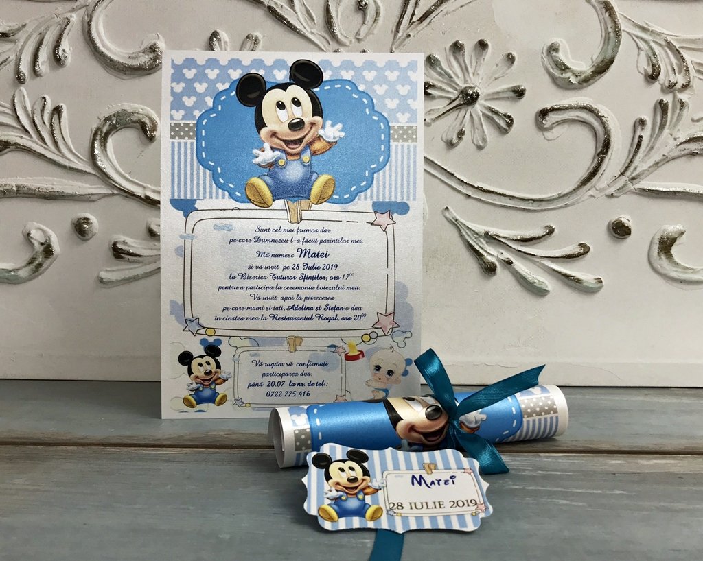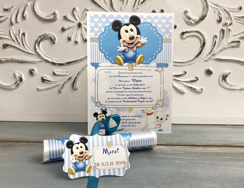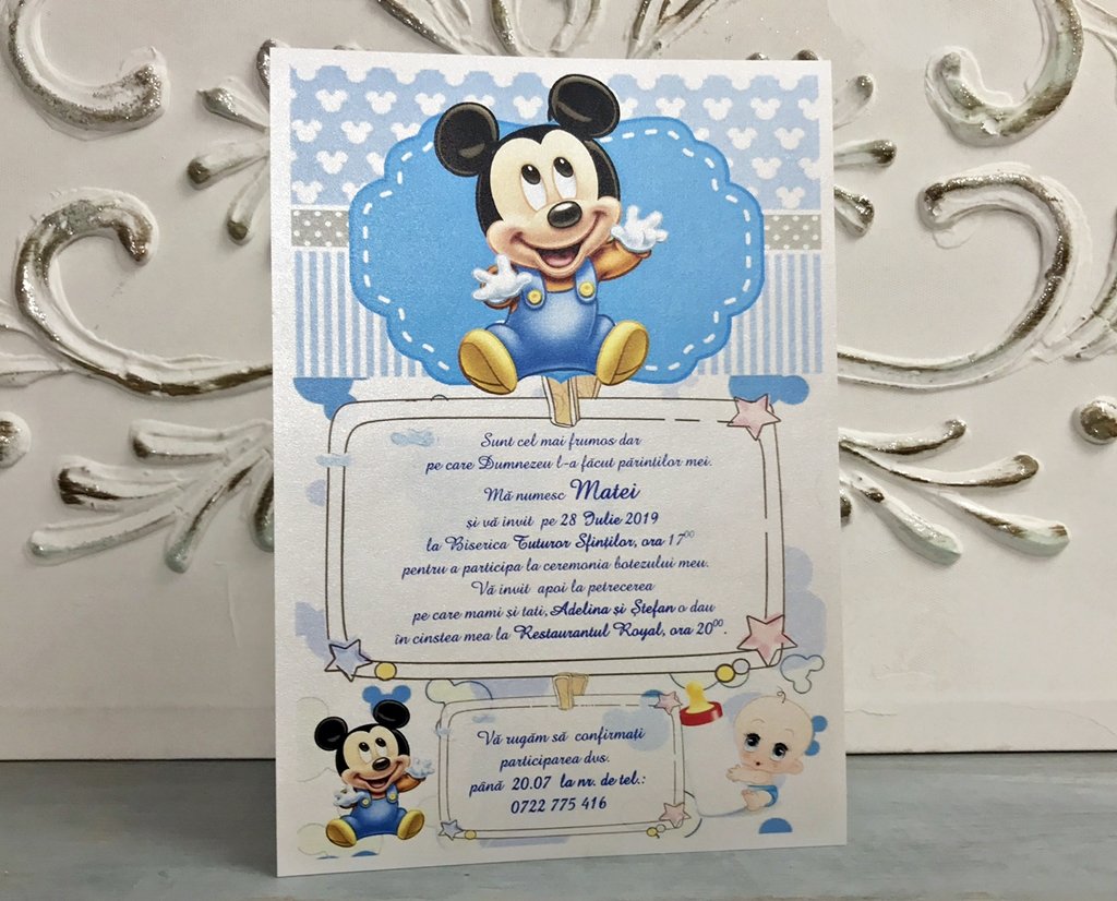 Invitatie de botez realizata din carton alb perlat (densitate carton 120 gmp) din Colectia Mickey Mouse