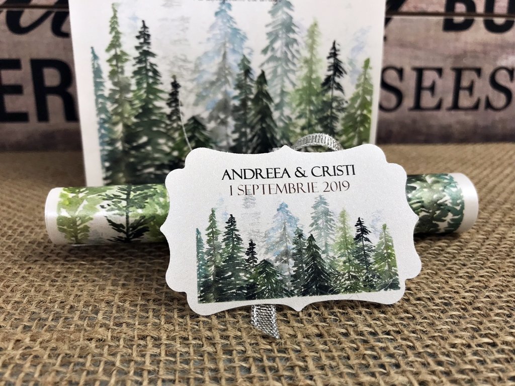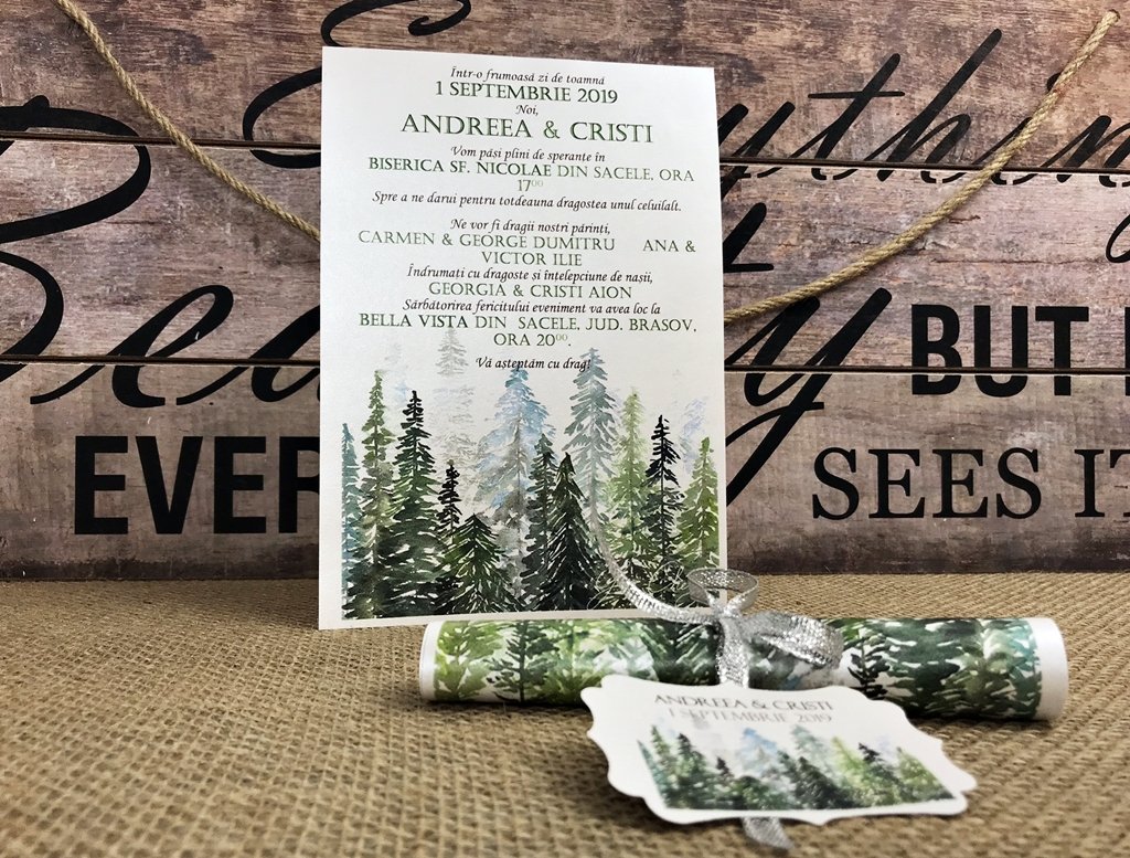 Invitatie de nunta realizata din carton alb perlat (densitate carton 120 gmp) imprimata cu imaginea unei superbe paduri montane pictate in tehnica aquarelei.
