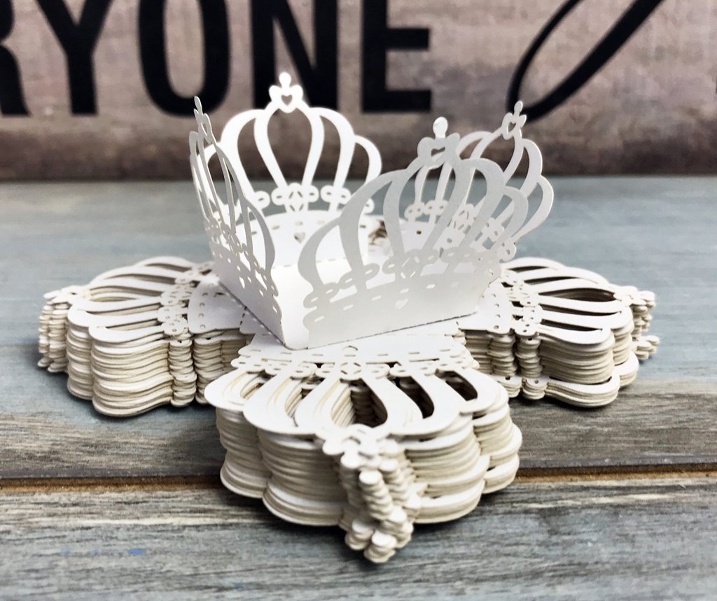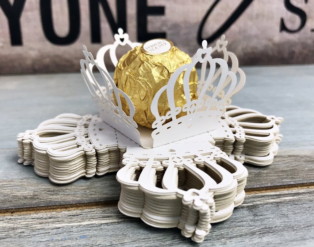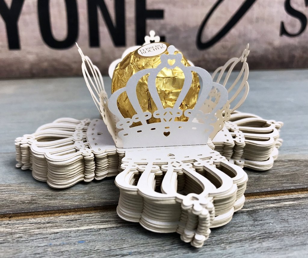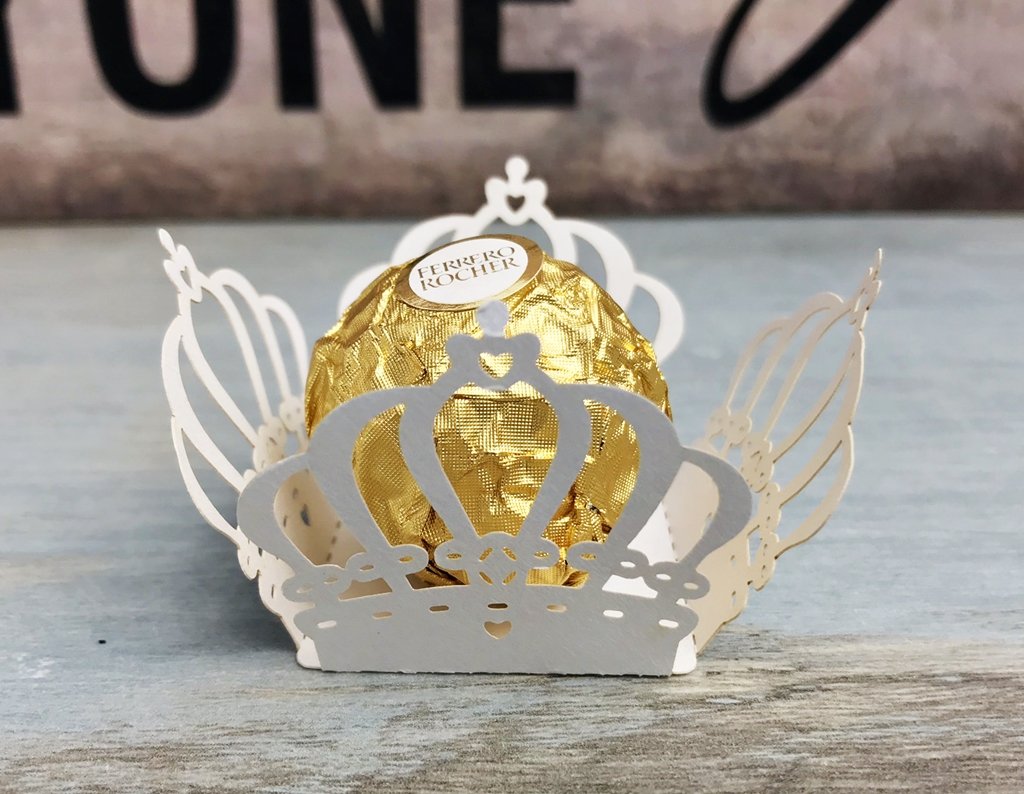Ambalaj in forma de CORONITA REGALA realizat din carton alb cu textura perlata si design lasercut, special creat pentru a sustine o bomboana de ciocolata Ferrero Rocher.