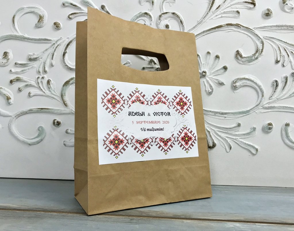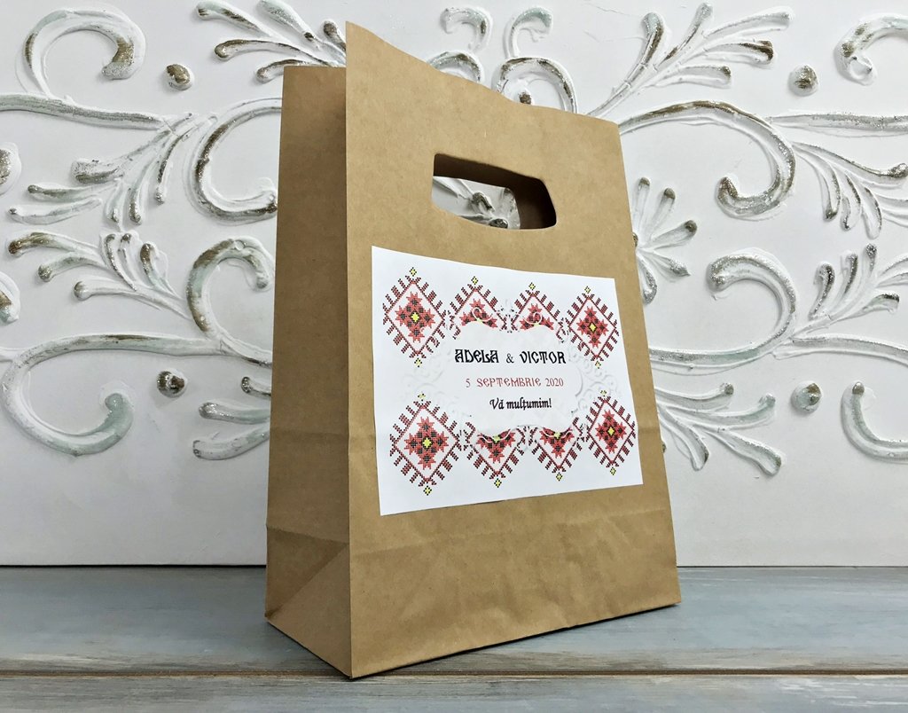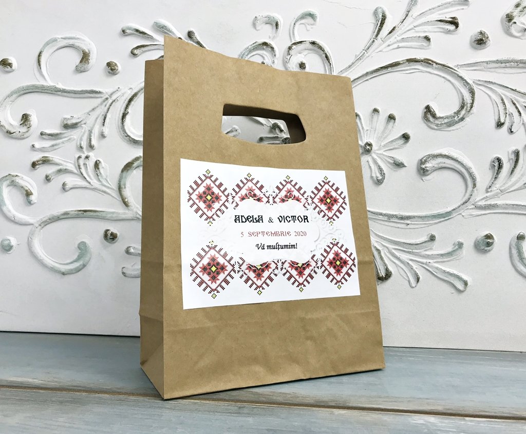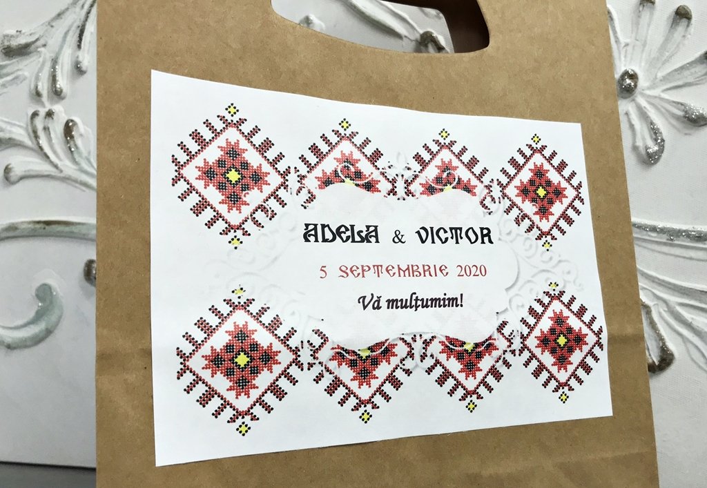 Punga este accesorizata cu o eticheta cu model traditional romanesc, personalizata cu numele mirilor si data evenimentului.