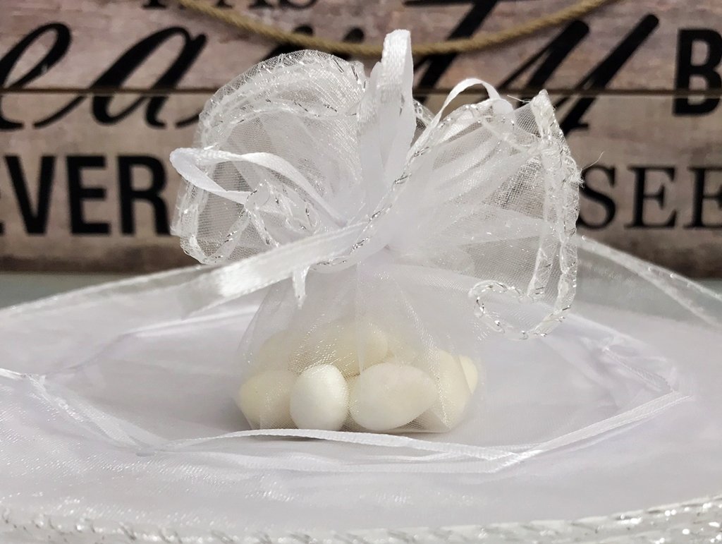 Asamblarea saculetului de organza inseamna: sa puneti in mijlocul cercului bomboanele sau ce doriti sa contina si sa trageti de snur pentru a-l strange.