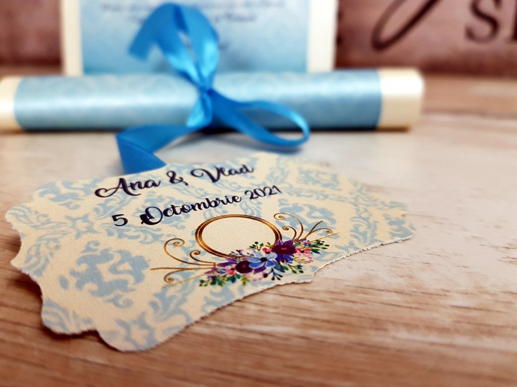 -rularea invitatiei si legarea cu fundita blue si lipirea etichetei cu dublu adeziv