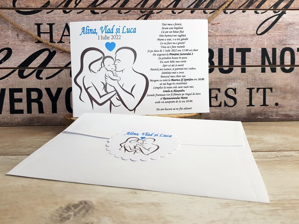 Invitatia este accesorizata cu o eticheta rotunda aceeasi imagine, personalizata cu numele bebelusului si data evenimentului