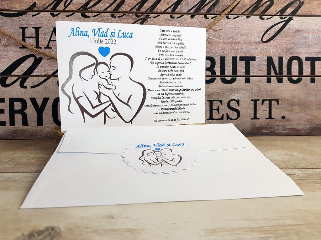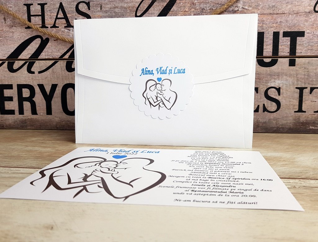 Invitatie de botez sau evenimente de tipul 2 in 1 realizata din carton alb cu textura mata si densitatea de 190gmp.