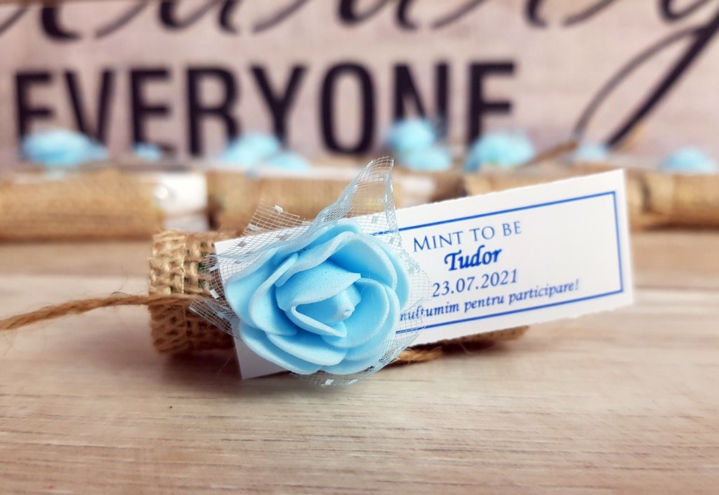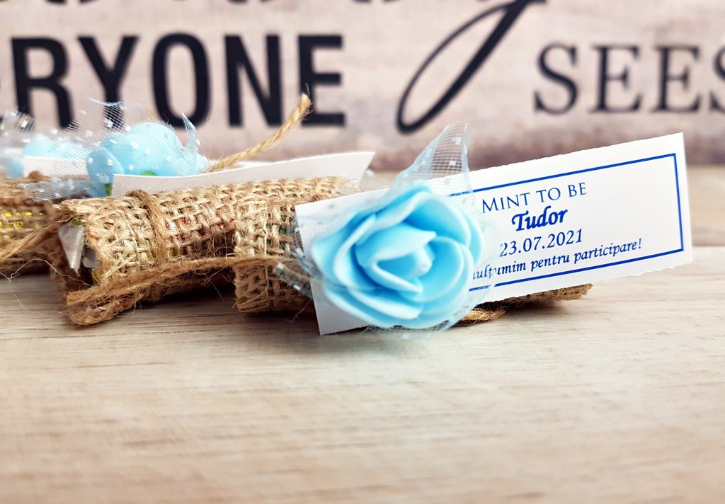 Bomboanele mentolate sunt invelite cu grija in panza naturala de iuta si accesorizate cu un trandafiras colorat. Marturiile sunt personalizate cu o eticheta cu numele & data evenimentulu insotite de mesajul MINT to BE.