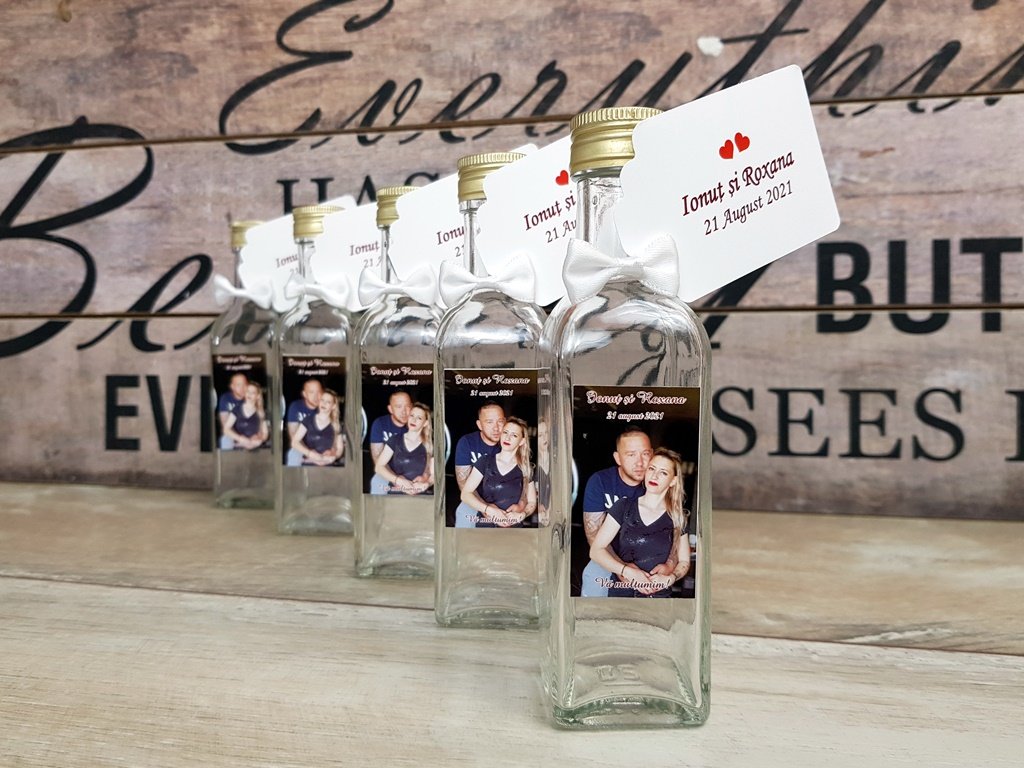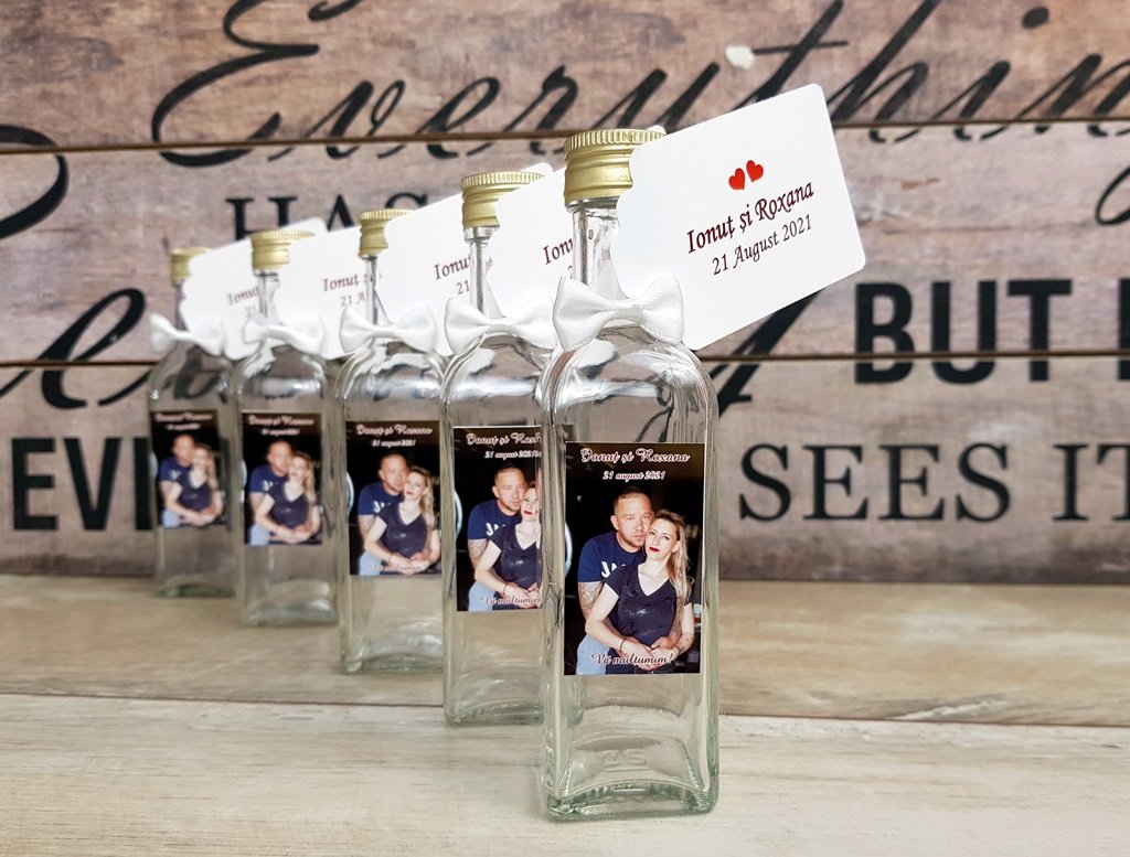 Marturie de nunta sau pentru evenimente de tipul 2 in 1 o superba sticluta decorata manual cu un fundita si o eticheta personalizata cu numele mirilor si data evenimentului. Sticlele pot fi umplute cu VIN, TUICA, PALICA, COGNIAC sau orice altceva doriti sa faceti cadou celor invitati la eveniment.