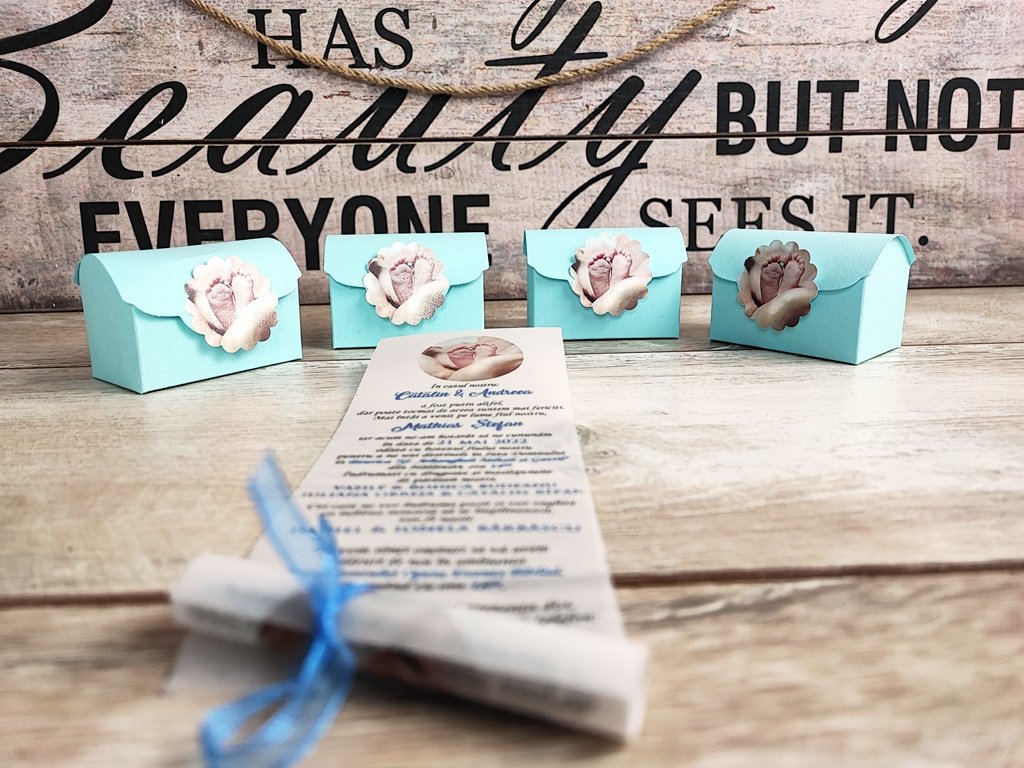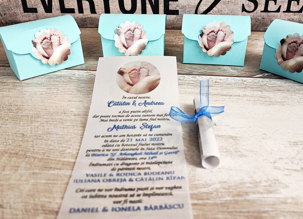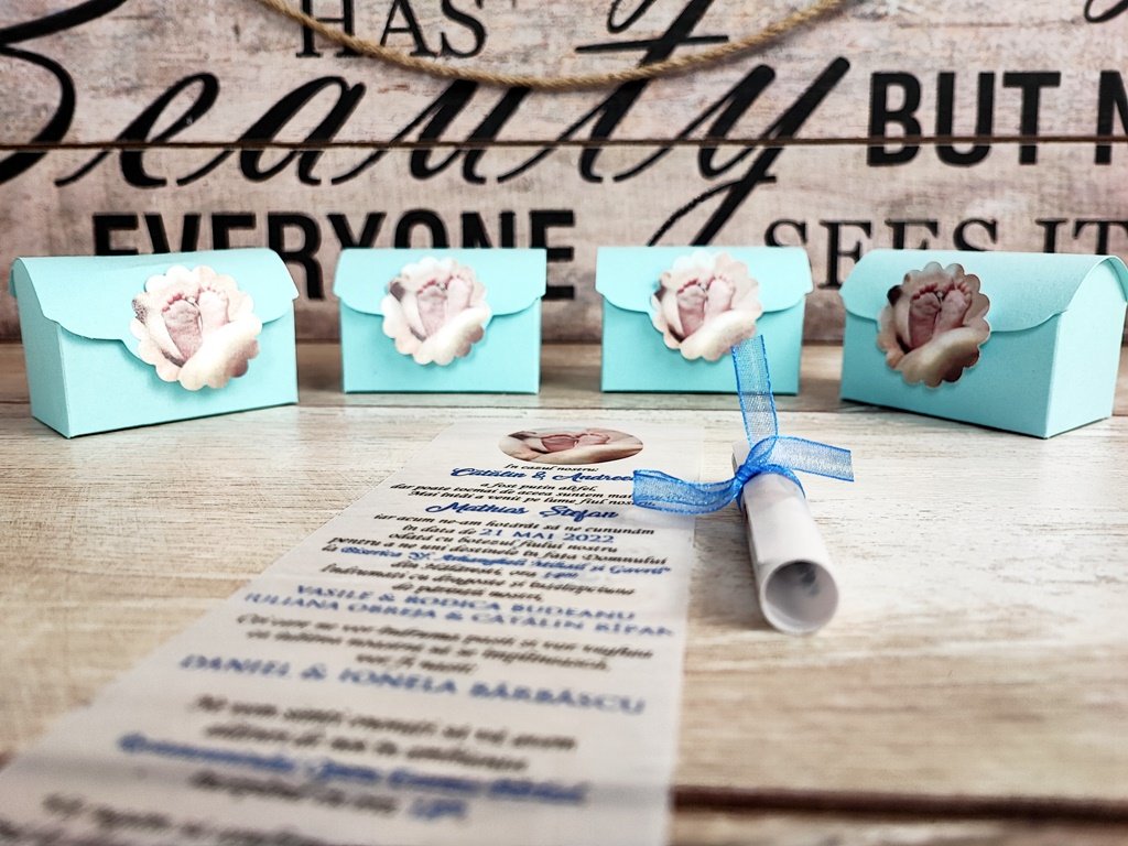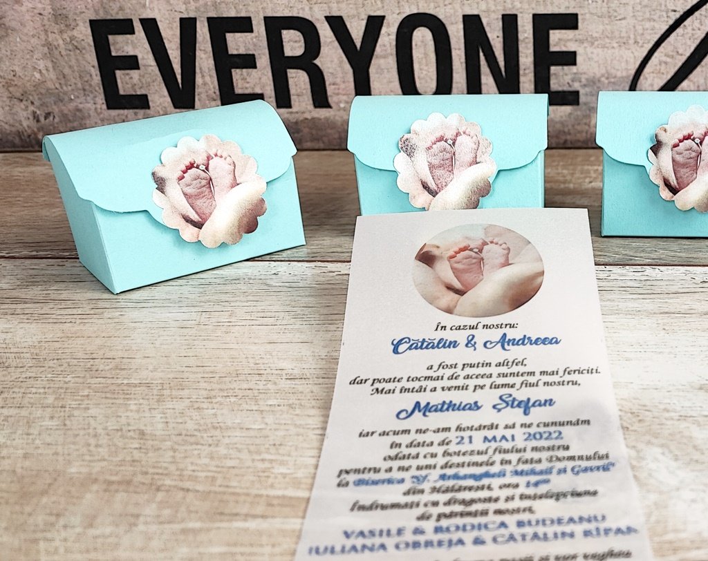 - Cufar (carton alb, textura mata, densitate 200 gmp) accesorizat cu o eticheta cu fotografia cu piciorusele bebelusului & mainille parintilor