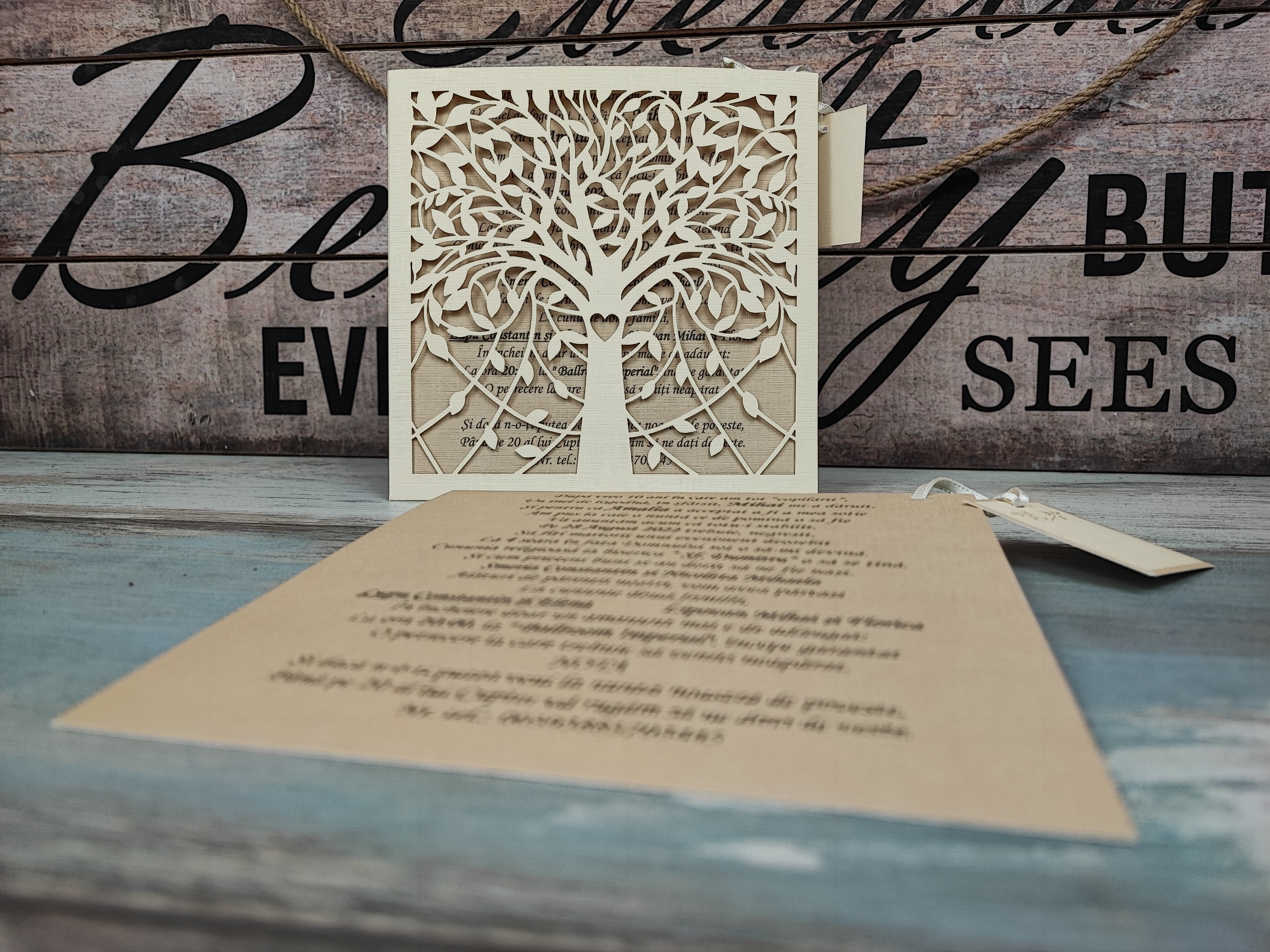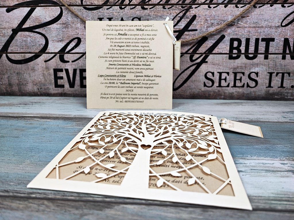 Acesta se introduce intr-un plic tip buzunar care are decupaj in forma copacului vietii. Acest model nu contine plic clasic. Invitatia se personalizeaza cu textul pe care il doriti, corespunzator evenimentului dvs.Eticheta nu se tipareste cu text.