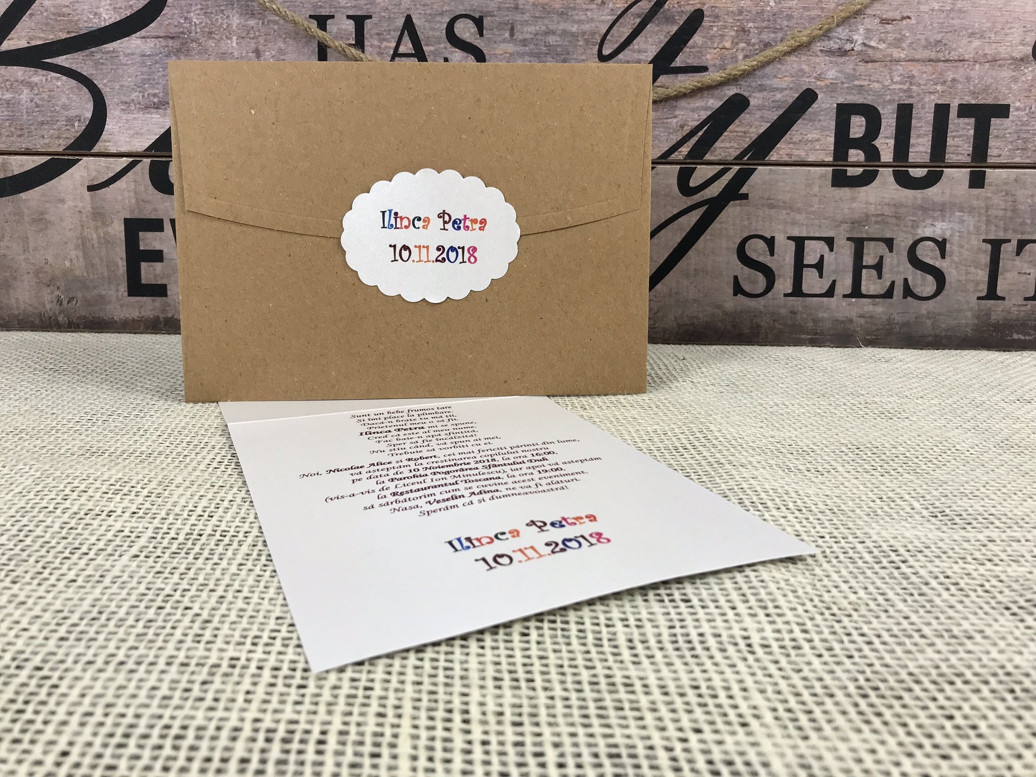 Invitatia are plic craft accesorizat cu o eticheta ovala.