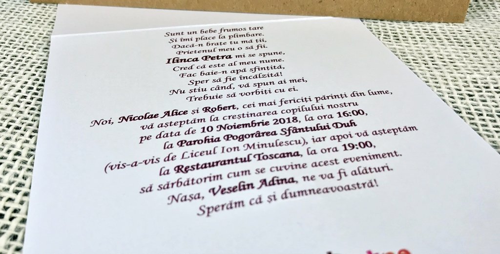 Va rugam sa verificati imediat ce ati primit coletul produsele primite (numarati toate elementele componente ale invitatiilor, daca este cazul) si sa ne informati asupra intentiei dvs de returnare sau asupra problemelor constatate in maxim 3 zile lucratoare.