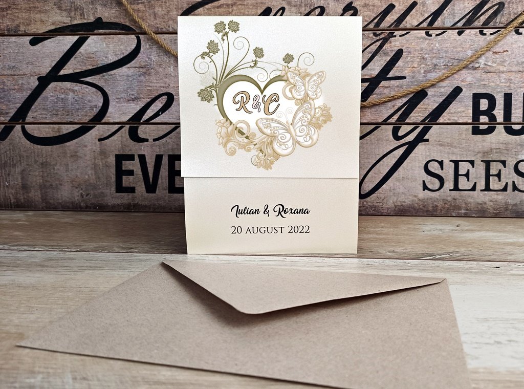 Pe fata invitatiei este imprimata o inima aurie stilizata, iar textul este tiparit in interior.
