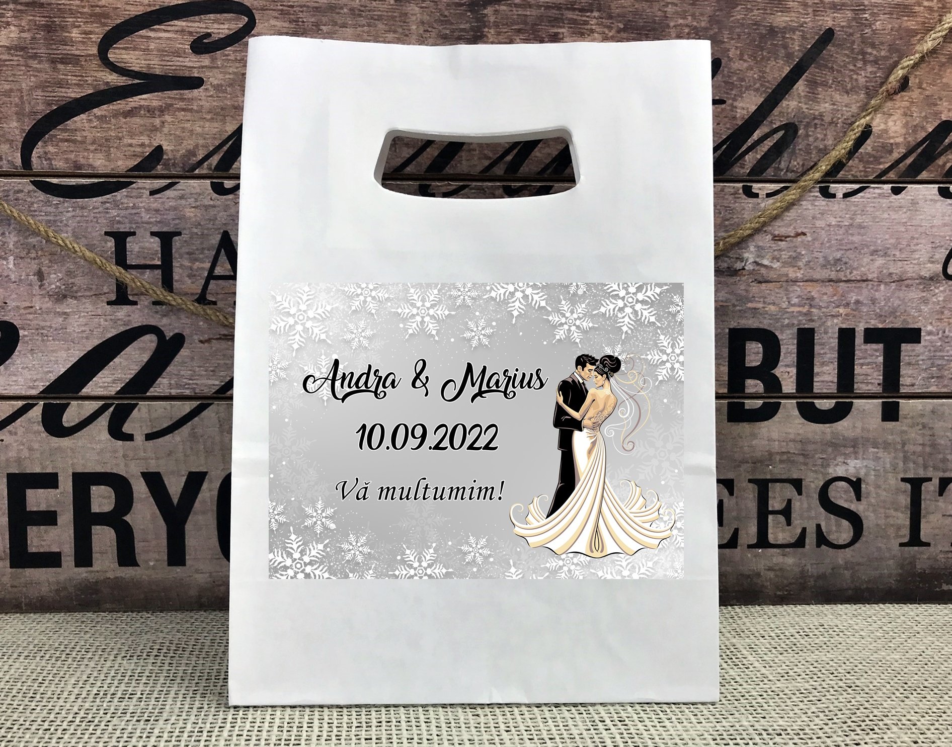 Punga este accesorizata cu o eticheta personalizata cu numele mirilor si data nuntii.