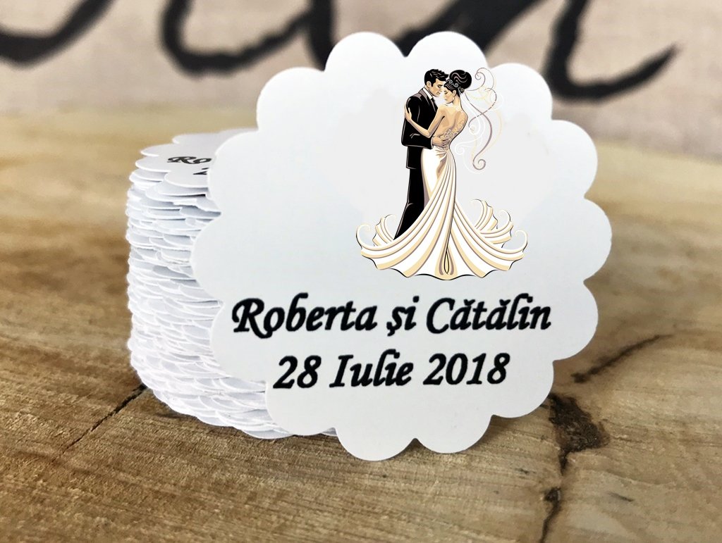 Eticheta rotunda pentru marturii de nunta confectioanata din carton alb cu textura lucioasa si 200 g grosime.