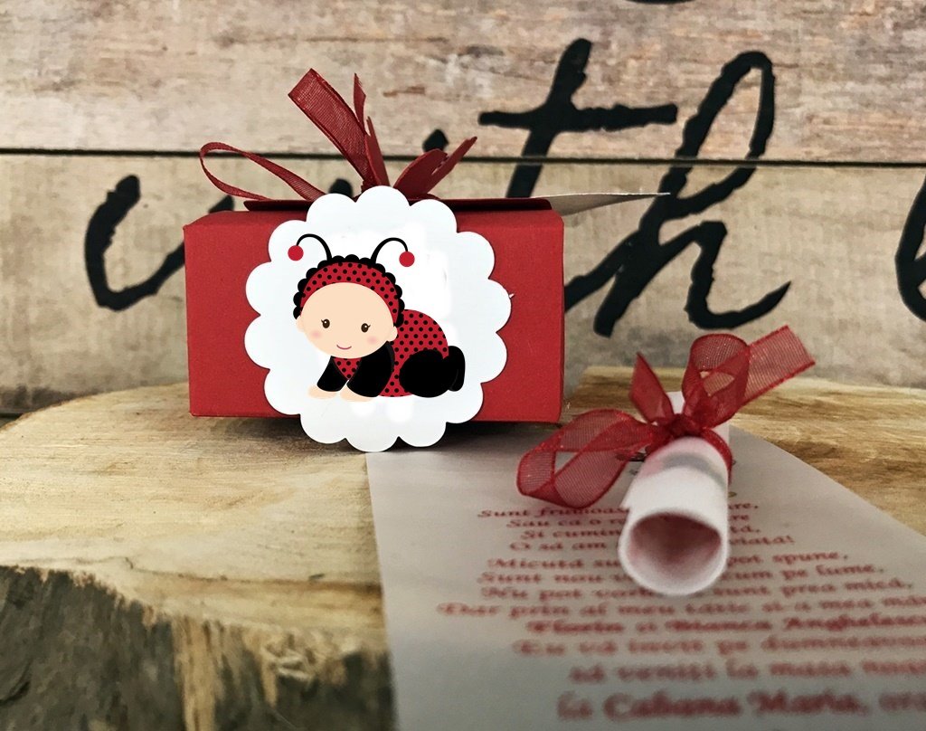 - cutie roside accesorizata cu o eticheta cu bebe gargarita si cu o eticheta vesela pe care tiparim numele copilului si data evenimentului.