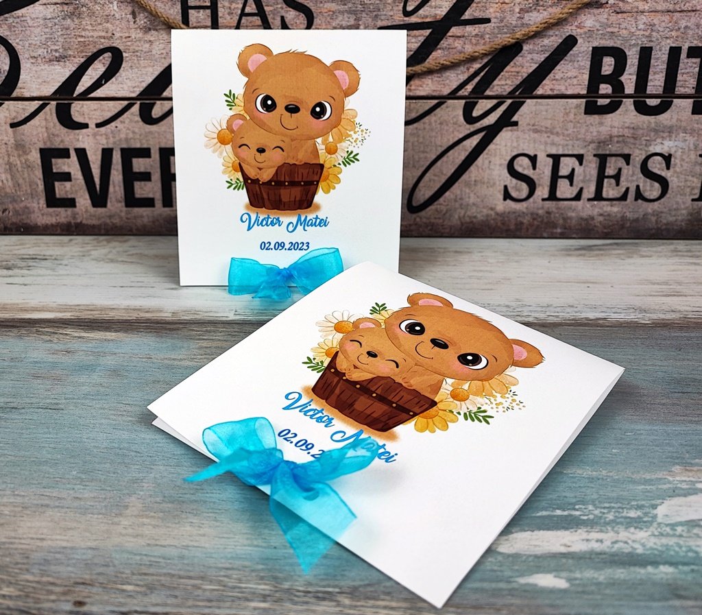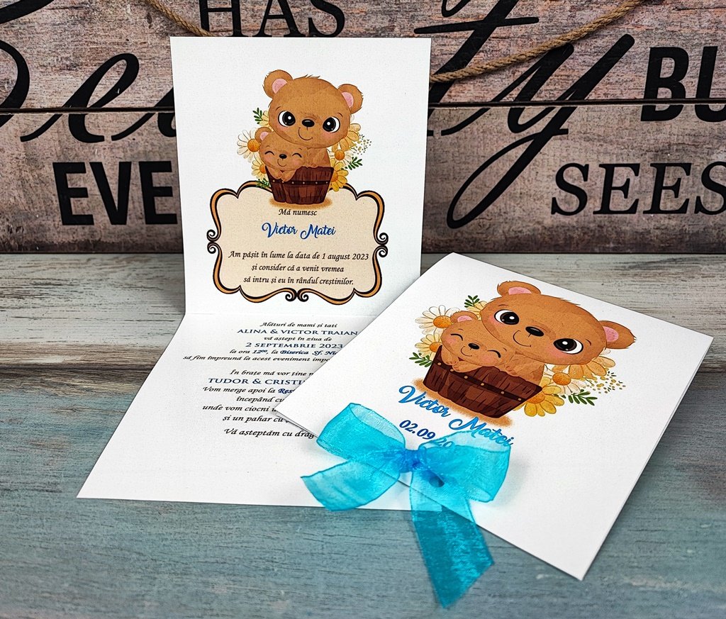 Pe fata invitatiei este tiparita o imagine cu o familie fericita de ursuleti. Invitatia se deschide in sus ca o felicitare si in interior se tipareste textul.