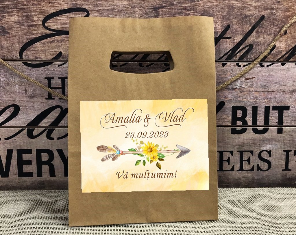 Punga este accesorizata cu o eticheta personalizata cu numele mirilor si data nuntii.