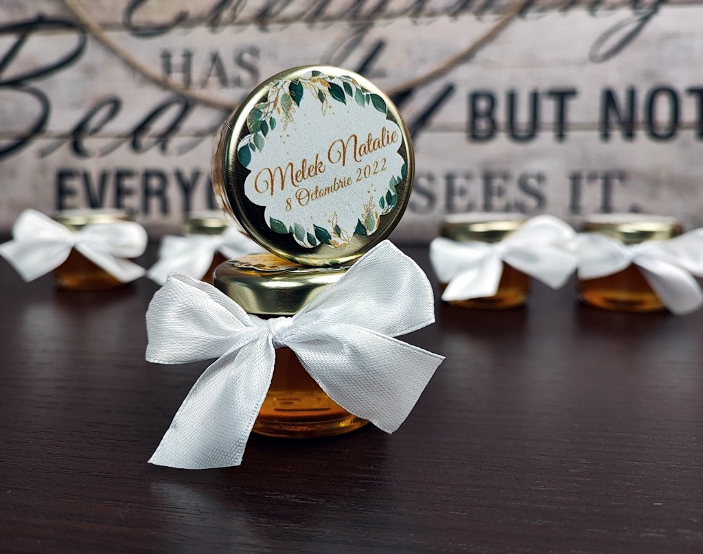 Borcanelul cu miere este decorat cu o pamblica din satin de 2 cm