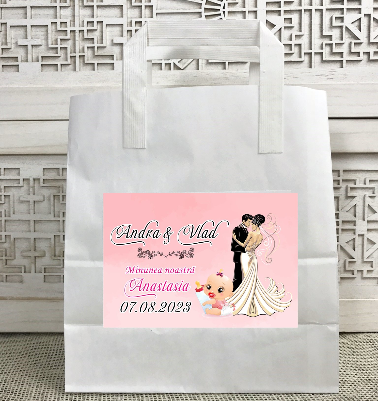 Punga este accesorizata cu o eticheta personalizata cu numele mirilor si copilului precum si data evenimentului.