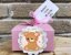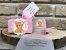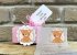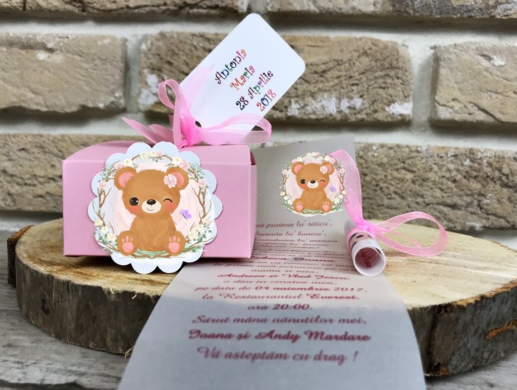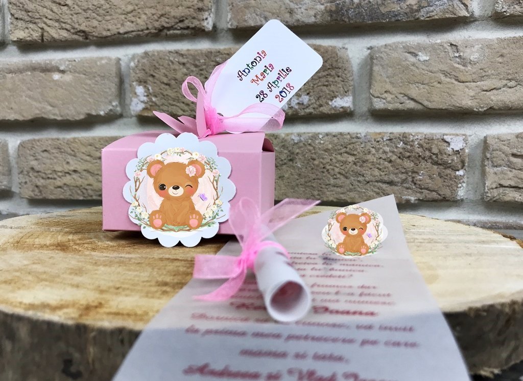 - cutie roz accesorizata cu o eticheta cu un ursulet fetita si cu o eticheta vesela pe care tiparim numele fetitei si data evenimentului.