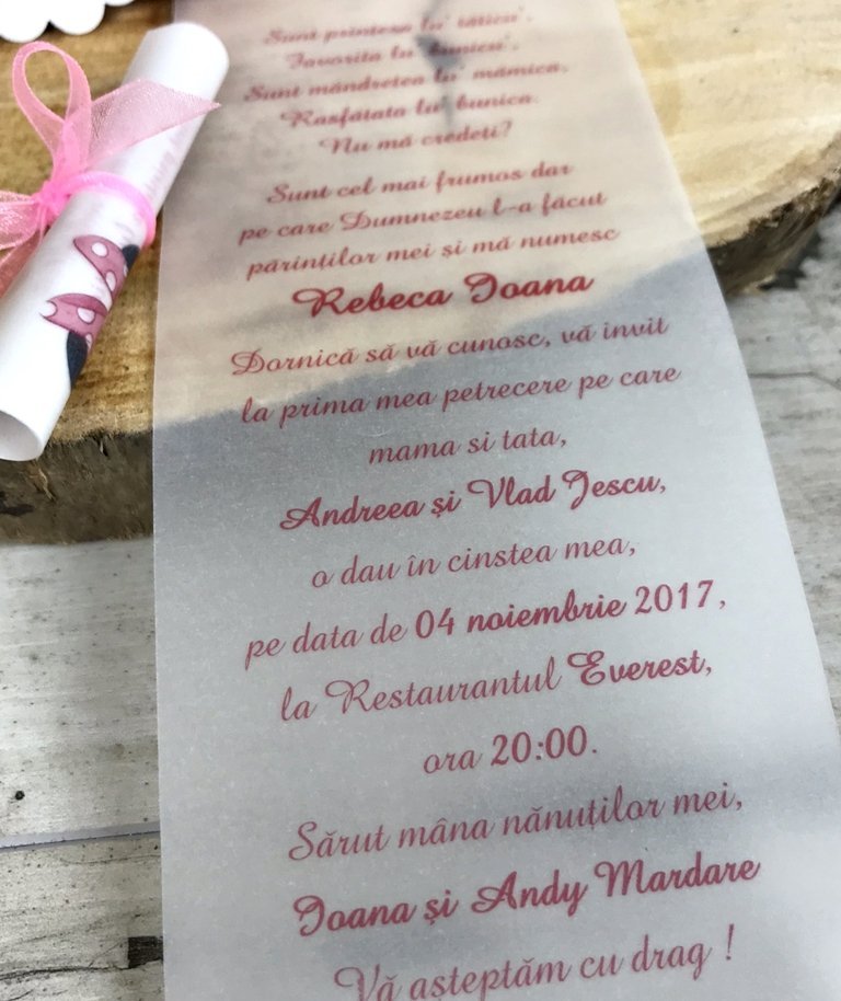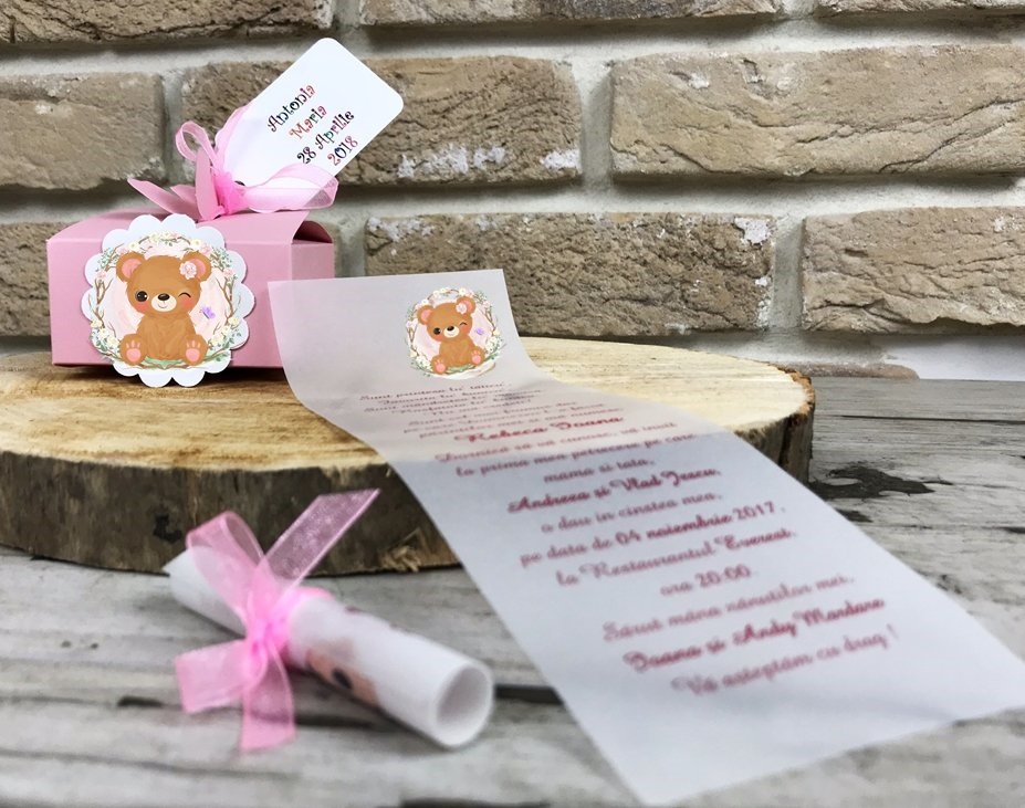- hartie de calc destinata tiparirii textului cu un ursulet. Invitatia se ruleaza si este prinsa cu ajutorul unei pamblici de organza roz.