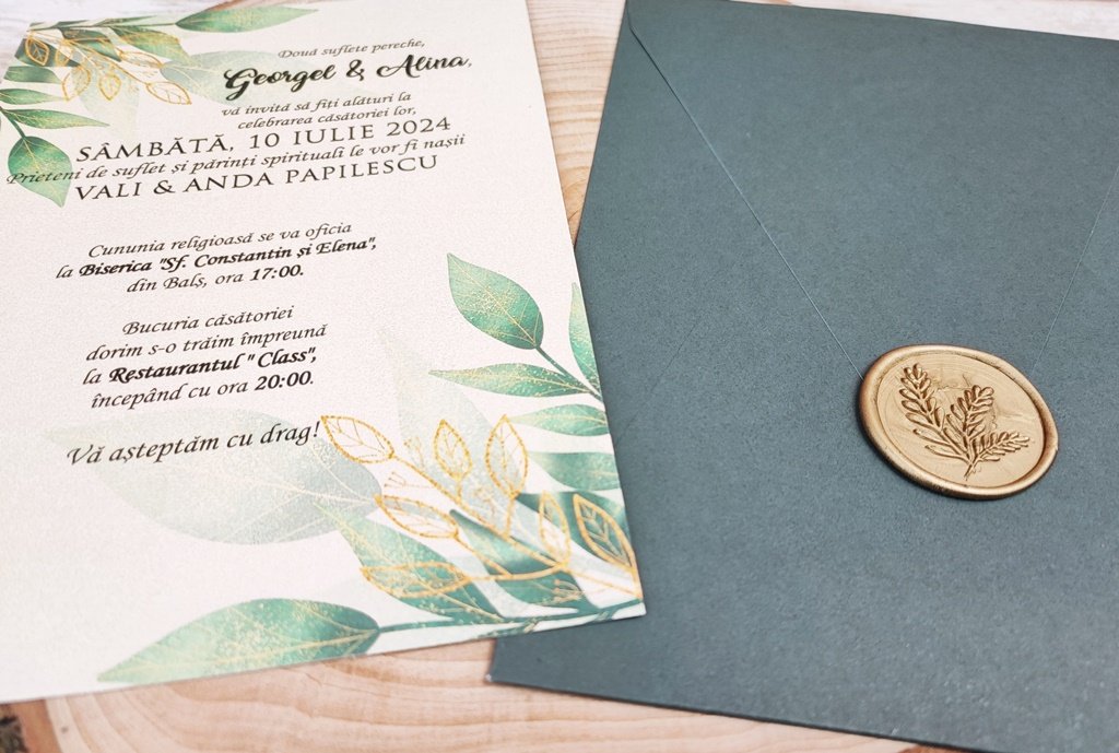 un sigiliu din ceara naturala de culoare aurie si cu model de frunze care se aplica pe plic la inchidere.