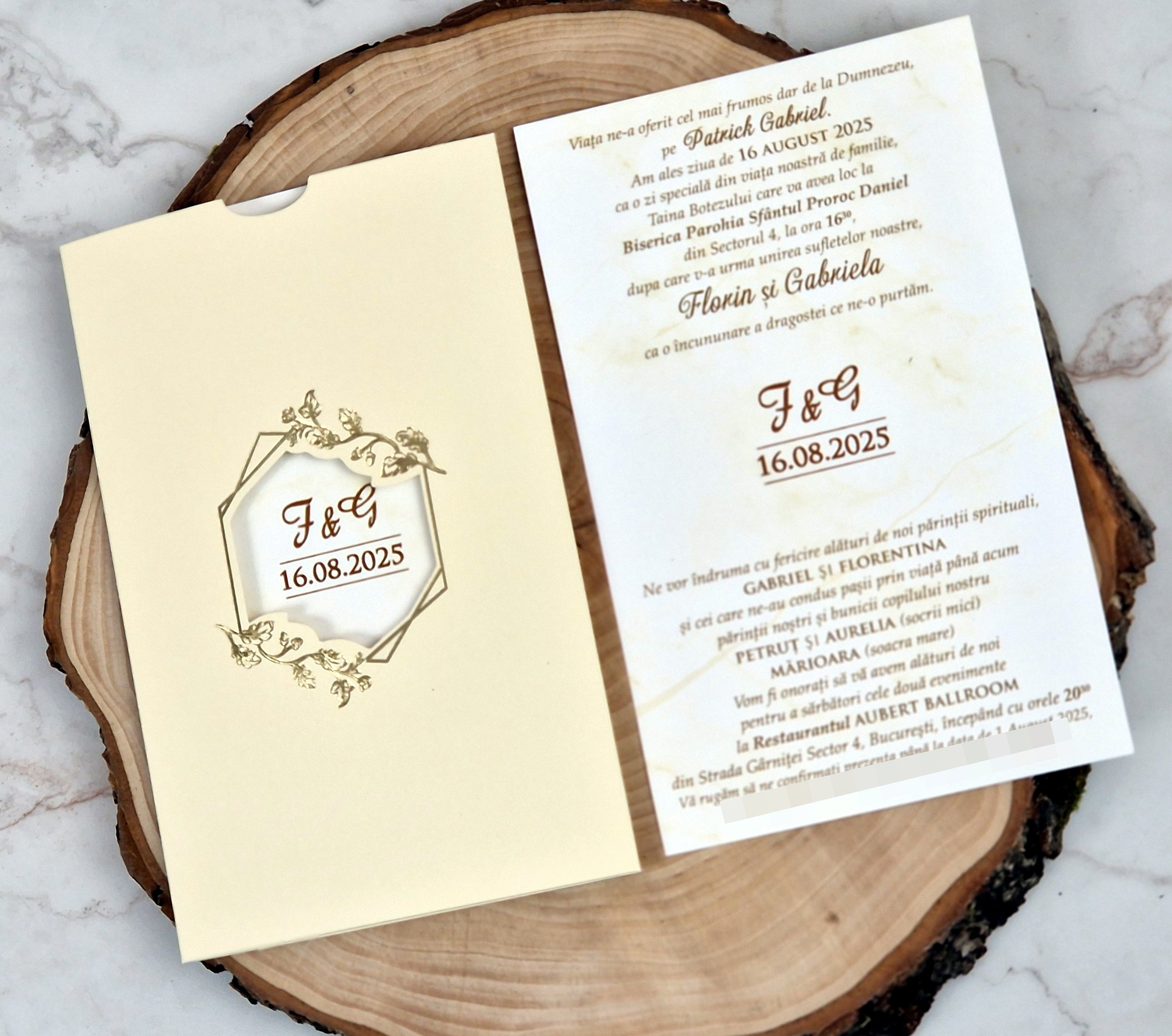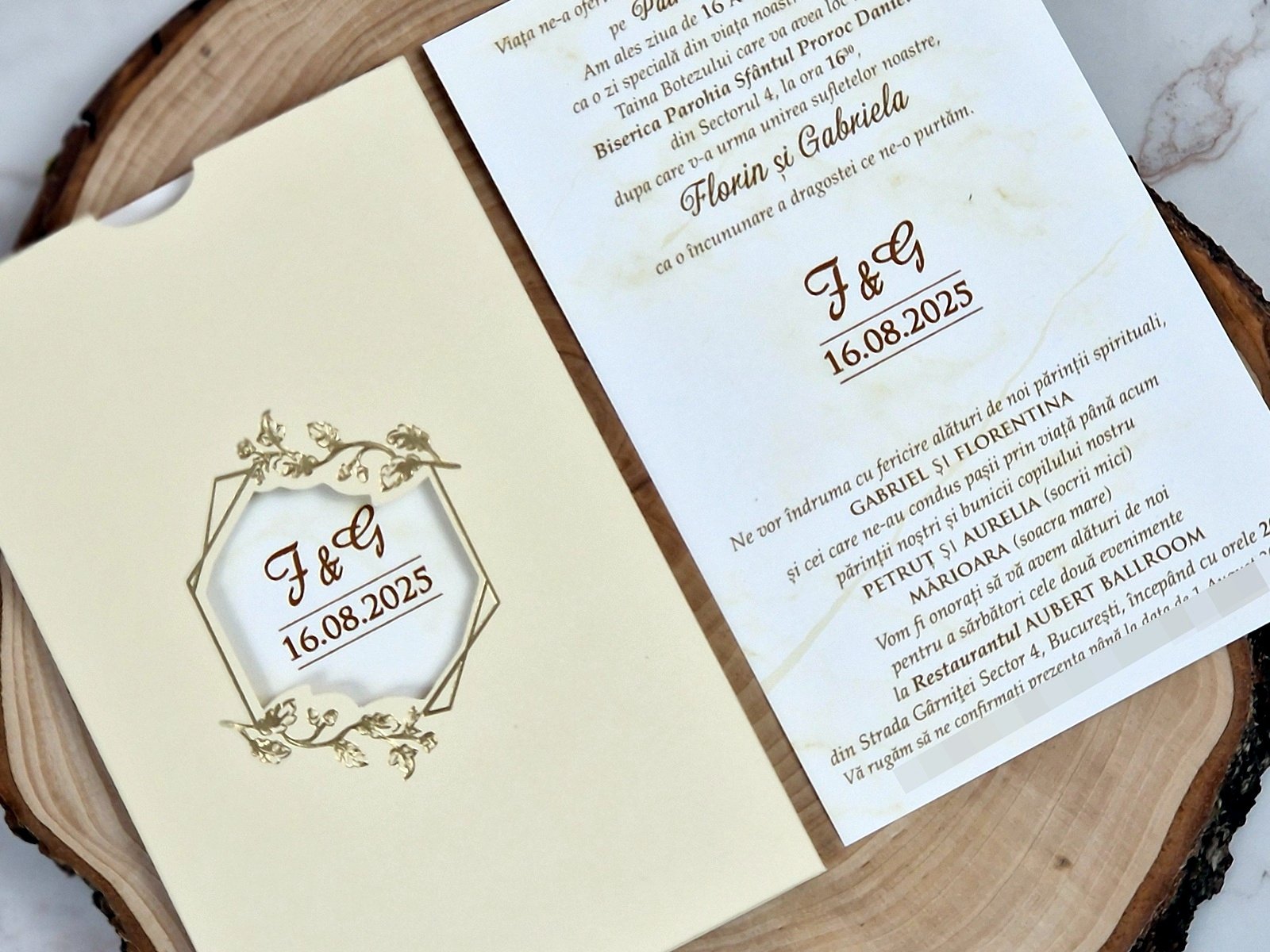 Aceasta invitatie de nunta rafinata, cu o combinatie sofisticata de crem si auriu, este alegerea perfecta pentru a celebra iubirea.