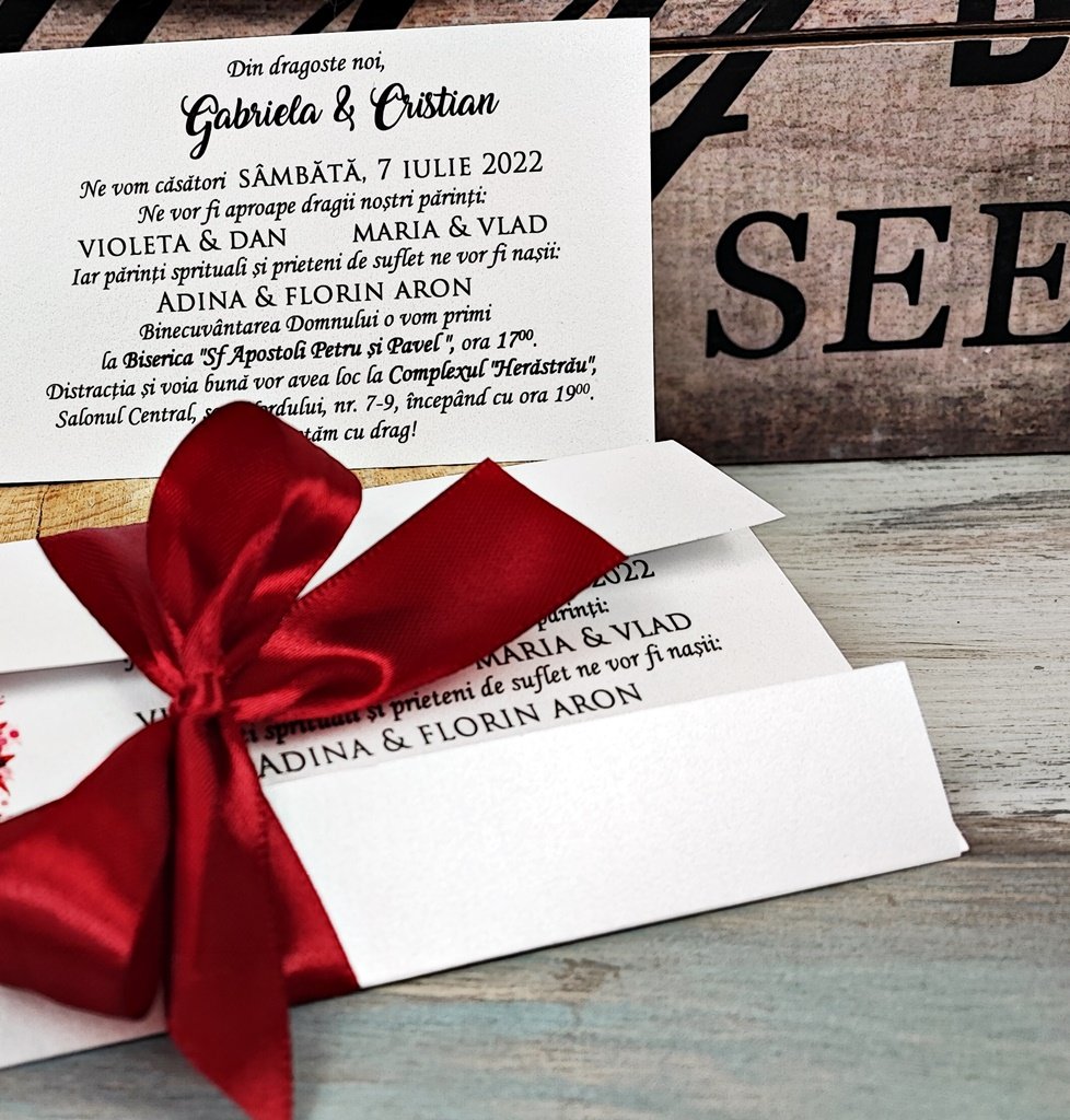 Coperta invitatiei este din acelasi carton alb sidefat si este legata cu o fundita rosie de satin