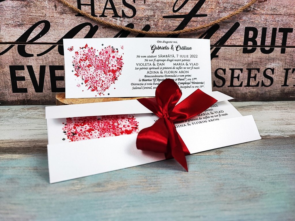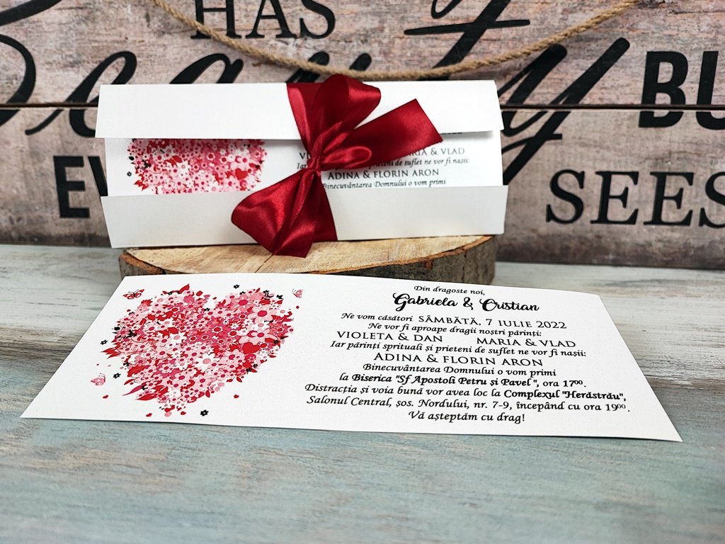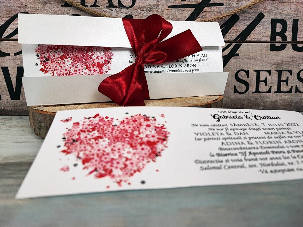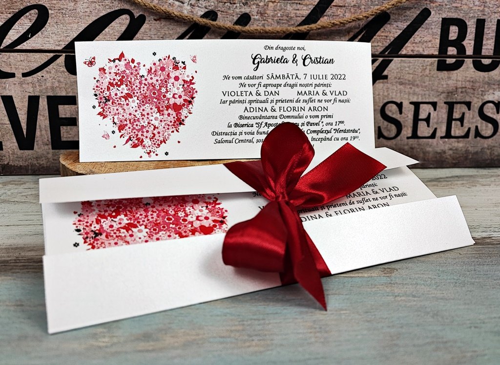 Invitatia este realizata din carton alb cu textura sidefata, imprimat cu o inima rosie realizata din flori.